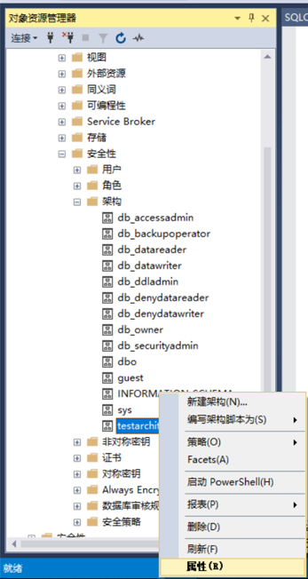 1、连接服务器-》展开数据库文件夹-》选择数据库并展开-》展开安全性文件夹-》展开架构文件夹-》选择要修改的架构右键点击属性。