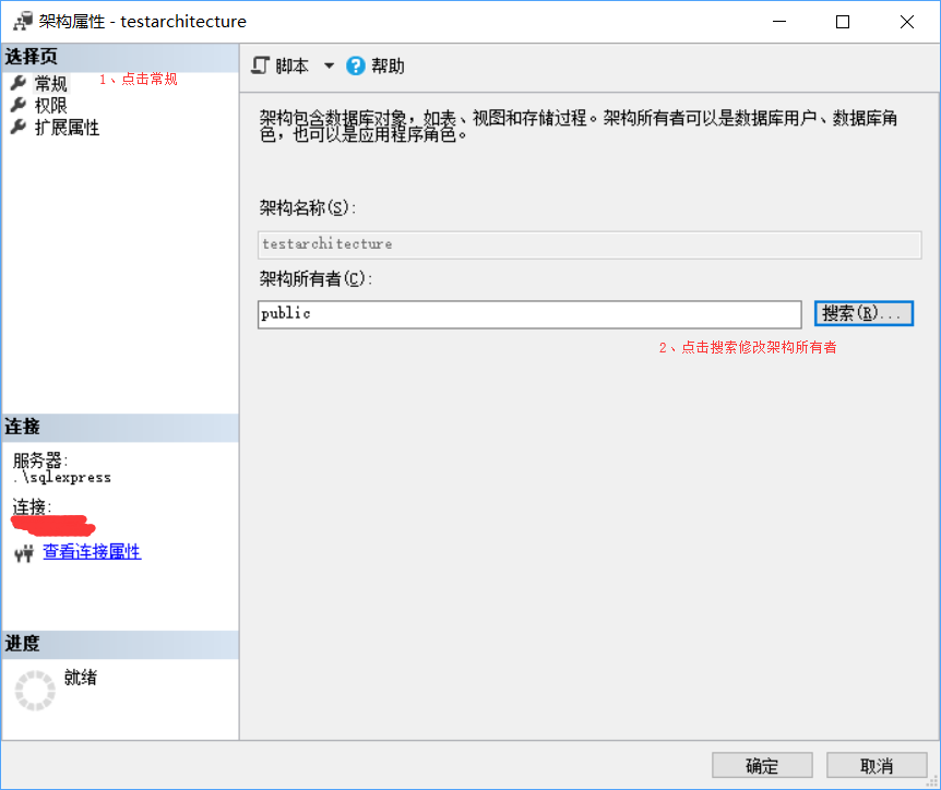 2、在架构属性弹出框-》点击常规-》点击搜索修改架构所有者。
