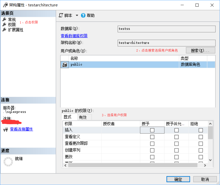 3、在架构属性弹出框-》点击权限-》点击搜索选择用户或角色-》选择用户或角色权限。