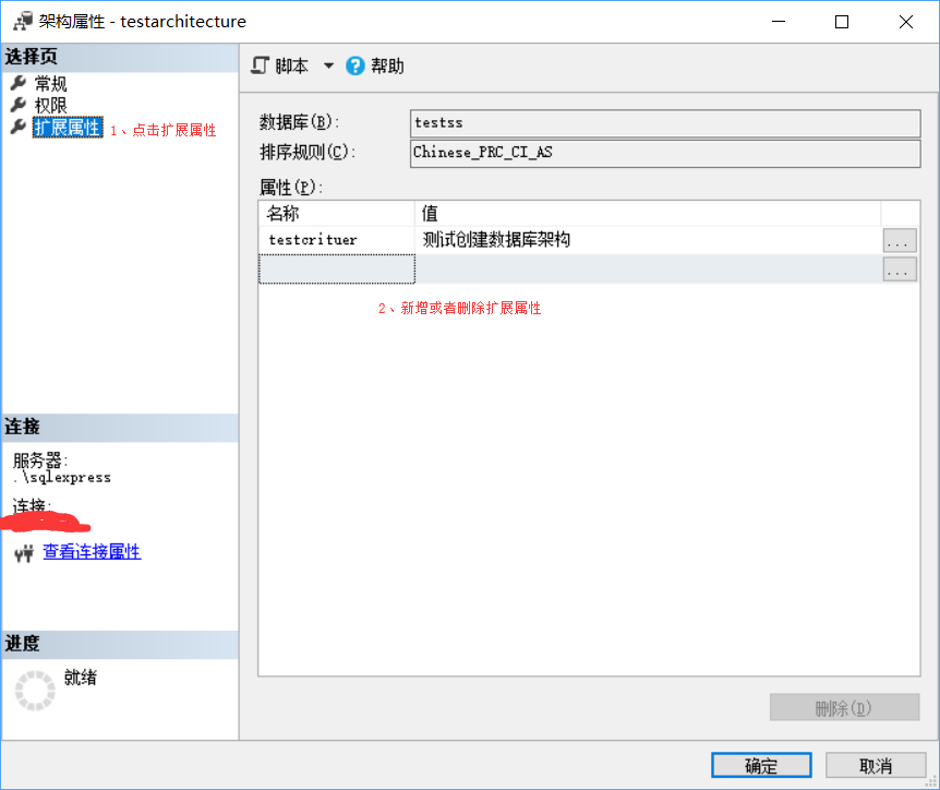 4、在架构属性弹出框-》点击扩展属性-》新增或者删除扩展属性。