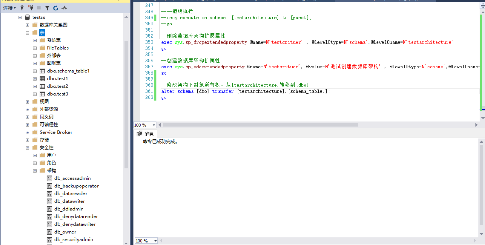 exec sys.sp_addextendedproperty @name=n'testcrituer', @value=n'测试创建数据库架构' , @level0type=n'schema',@level0name=n'testarchitecture'