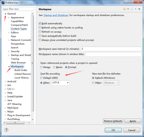 修改eclipse默认工作空间编码方式,general——workspace——text file encoding