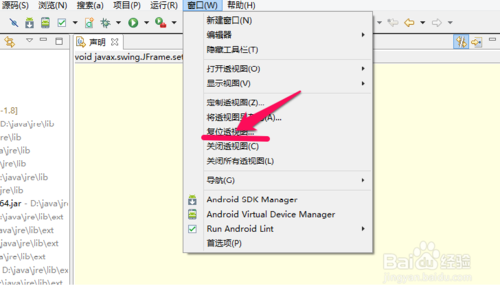 选择Eclipse工具栏中的“窗口”选项,找到“复位透视图”选项。