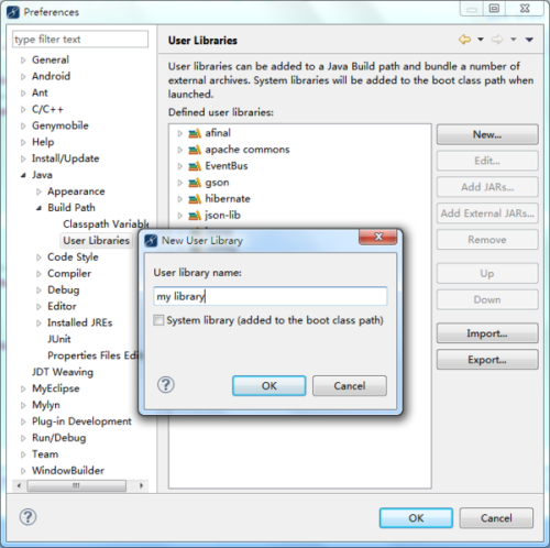 选择Java——Build Path——User Libraries,点击New,输入LibrariesName OK