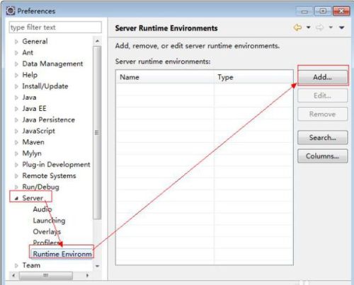 点击window中的Preferences选项,在打开的preferences面板中找到Server,点击Runtime Environments,再点击右边的“Add”按钮。
