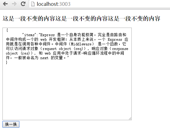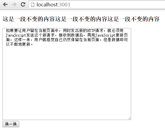 <h3>这是一段不变的内容这是一段不变的内容这是一段不变的内容</h3> <div class="content-box"> <textarea id="text">如果要让用户留在当前页面中,同时发出新的HTTP请求,就必须用JavaScript发送这个新请求,接收到数据后,再用JavaScript更新页面,这样一来,用户就感觉自己仍然停留在当前页面,但是数据却可以不断地更新。</textarea> </div> <button id="btnchange">换一换</button>