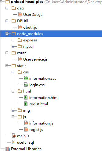 5.当然,不要忘了引入2个模块express和mysql,新建一个文件夹node_module,将这2个模块包含在其中。
