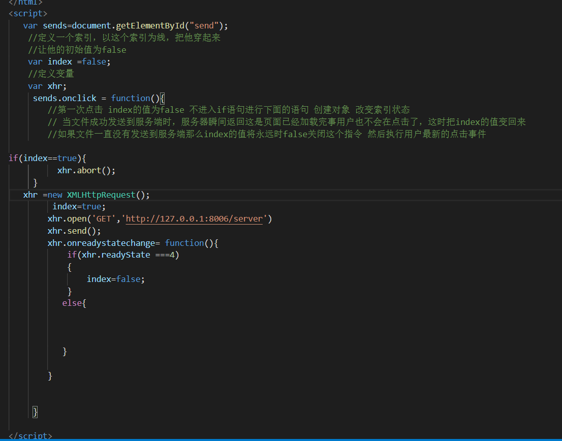 首先我们定义一个索引让他的值为false然后每次定义对象之后就让他的值为true当结果成功返回时再让他的结果为false当第二次点击的时候我们来判断索引的值看他到底是true还是false true的话就关闭这次请求false就发送请求
