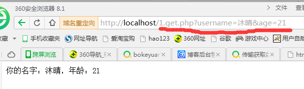 观察实验结果,当点击按钮,页面会跳到1.get.php页面,把内容输出。并且观察上面的地址栏,会发现我们输入的信息被放在了地址栏上。