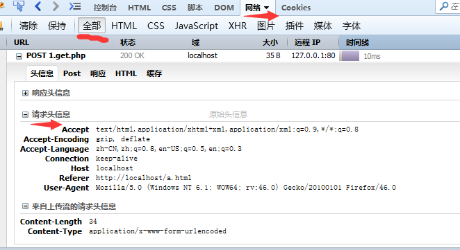其实在传递数据的过程中,浏览器还会向服务端(后台)发送一个请求头包含一些请求的信息(get请求也有头部信息),我们打开开发者工具,找到网络就可以看到我们的请求,点进去就是具体内容,看上面的第二种图,可以看到一些请求信息,有请求的编码格式,还有请求地址等,具体可以自己私下了解。