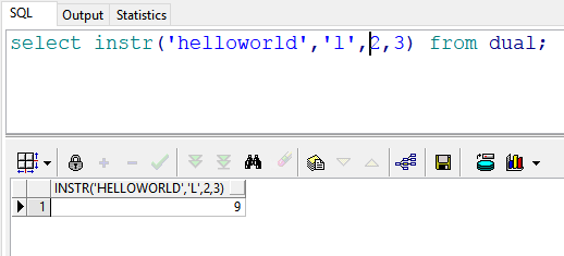 select instr('helloworld','l',2,3) from dual; --返回结果:9 也就是说:在"helloworld"的第2(e)号位置开始,查找第三次出现的“l”的位置