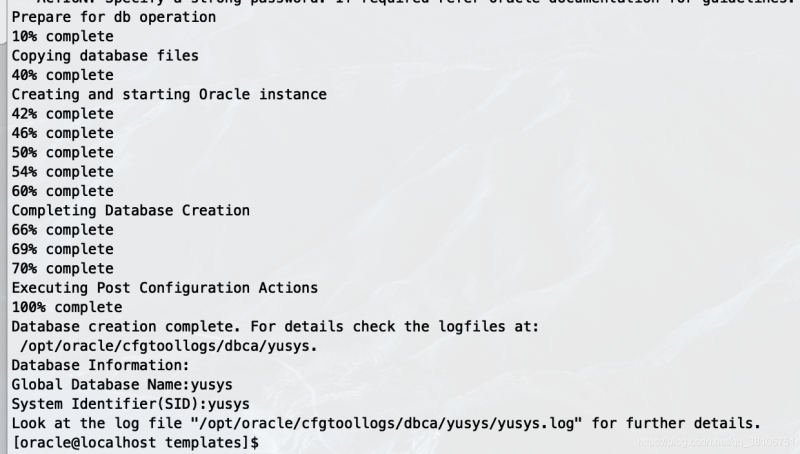 dbca -silent -createdatabase -templatename $oracle_home/assistants/dbca/templates/general_purpose.dbc -gdbname yusys -sid yusys -characterset al32utf8 -syspassword oracle -systempassword oracle -responsefile no_value -datafiledestination /opt/oracle/oradata