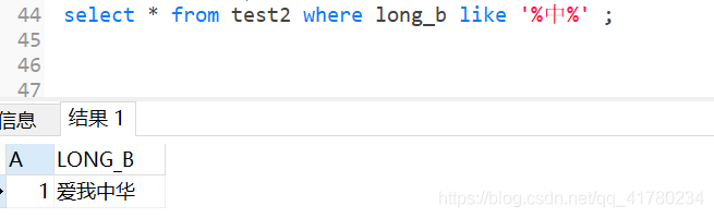 #创建测试表 create table test1(a number,b long); insert into test1 values(1,'爱我中华'); #创建新表用于模糊匹配 create table test2 (a number,long_b clob); delete from test2; insert into test2 (select o.a, to_lob(o.b) from test1 o); #进行模糊匹配 select * from test2 where long_b like '%中%' ;