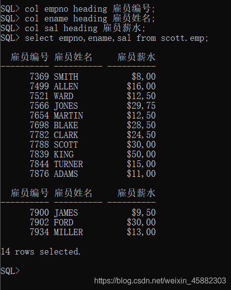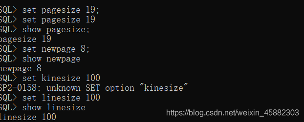 3、设置sql*plus的运行环境,包括每行的显示字符数、每页显示行数、每页打印标题前空行数。 set命令基本语法