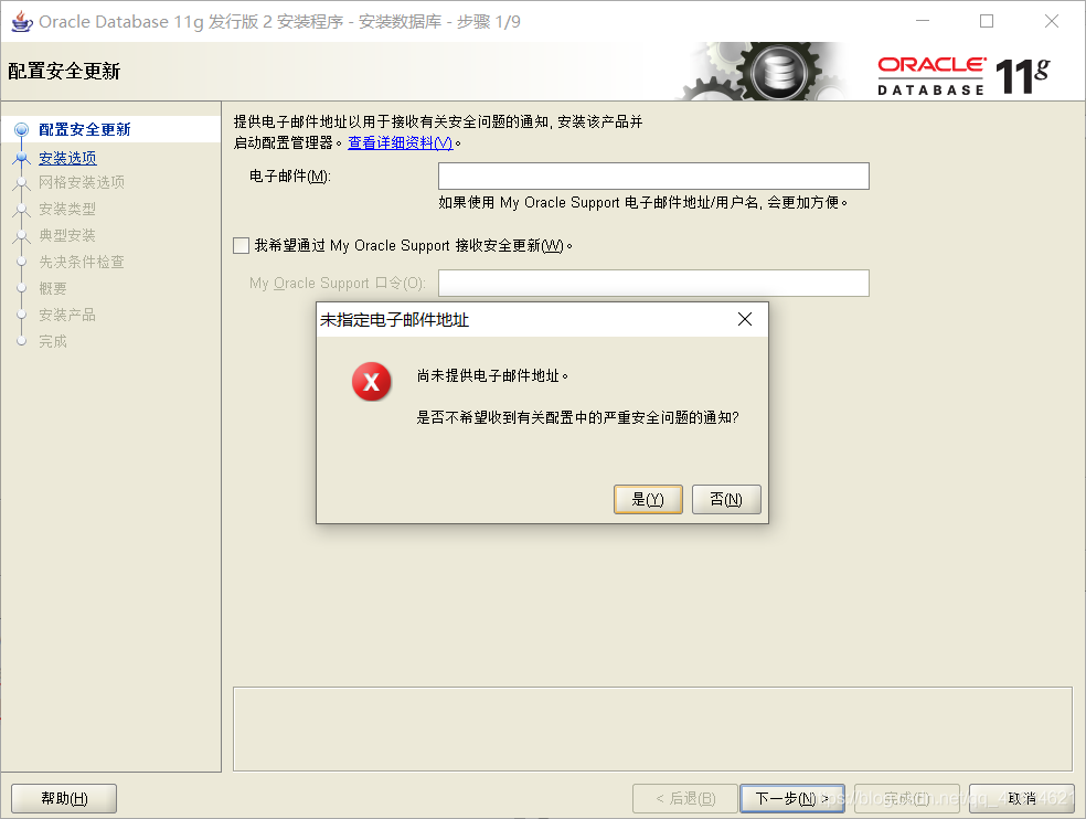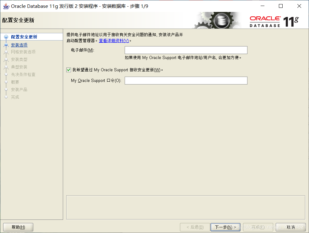 接着就回出现如下界面,可以填写自己的邮件地址,只是会收到一些邮件。根据自己的情况确定是否希望通过my oracle support,(我安装的时候,取消了这个对勾),然后点击进入下一步。