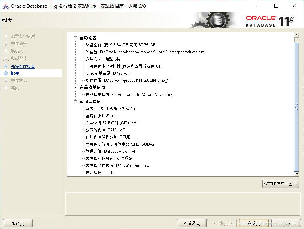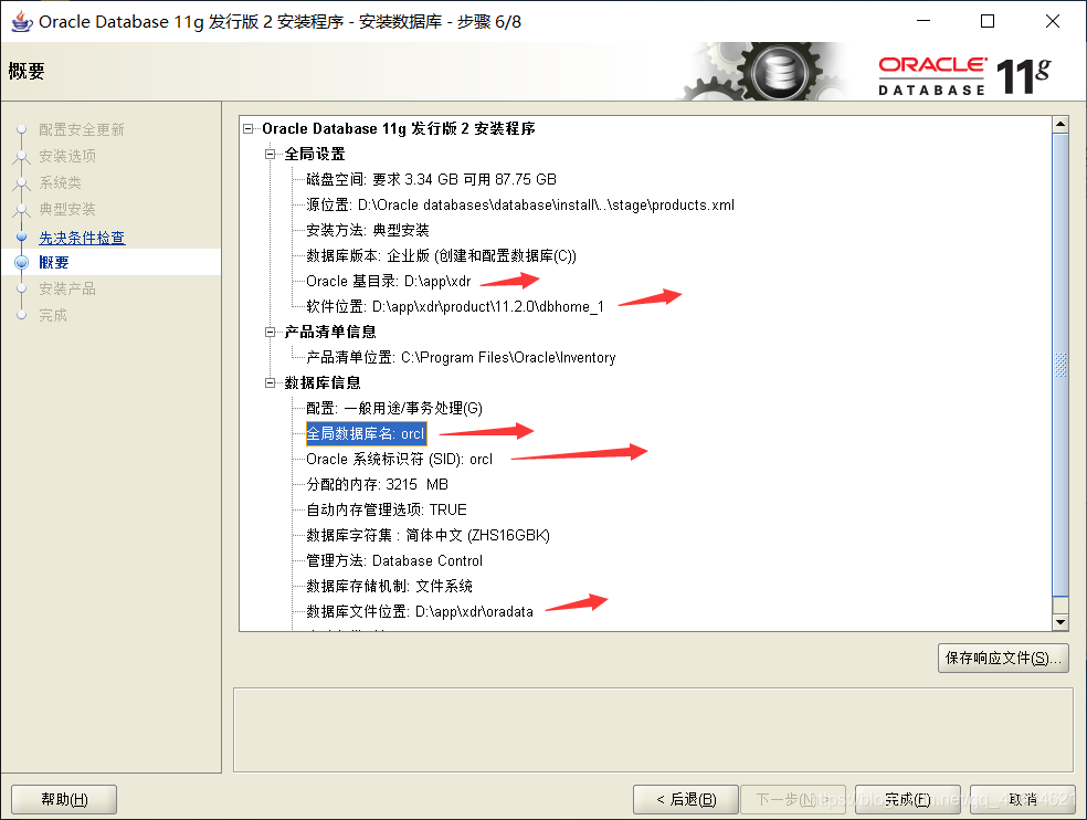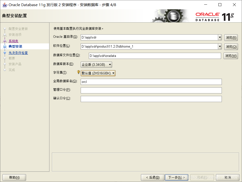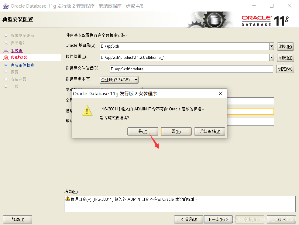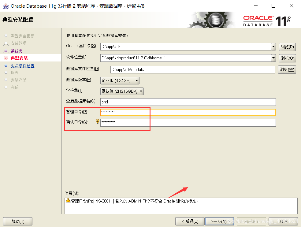 典例安装,建议只需要将oracle基目录自行选择,目录路径不要有中文或者其他特殊字符。全局数据库名字默认就可以,口令自己设置(因为oracle本身有自己的密码原则,所以会有提示你的密码不符合规则,如果只是用于个人学习可以忽视不管,不必在意安全性),版本一般选择企业版,也可以把字符集选择utf-8(因为utf-8的范围比gbk大),其他默认即可。