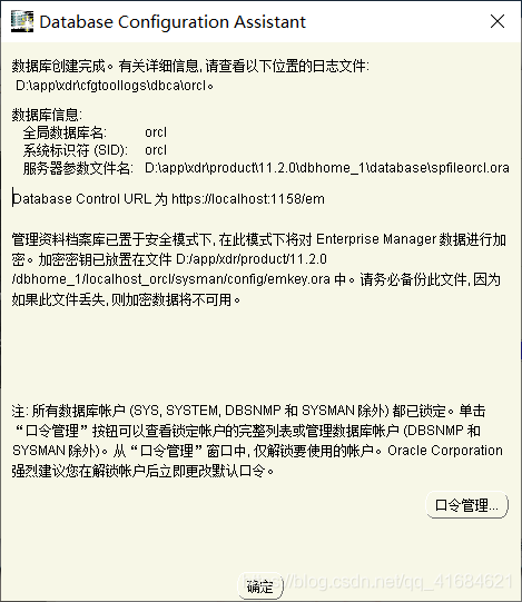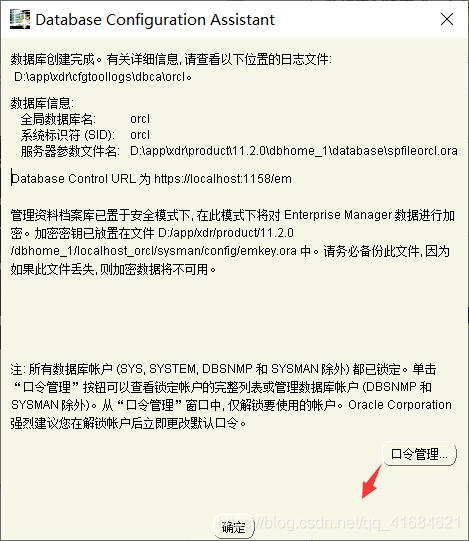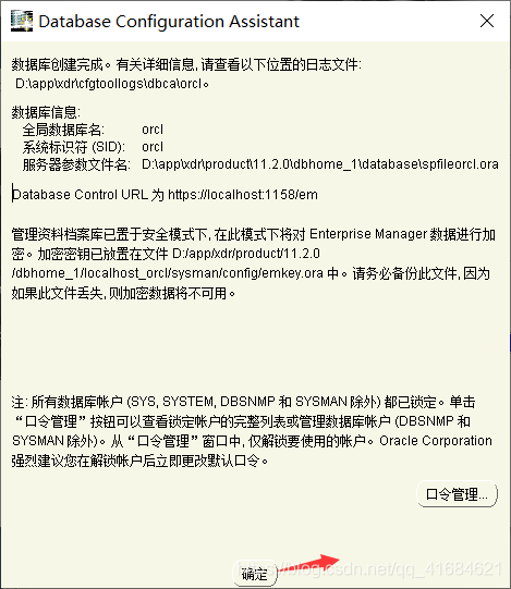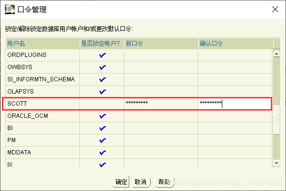 实例数据库创建完成了,系统默认把所有账户都锁定,不可用(除了sys和system账户外),点击右边的口令管理,将常用的scott用户解锁(点击√就行)输入自行设置密码,一般为tiger