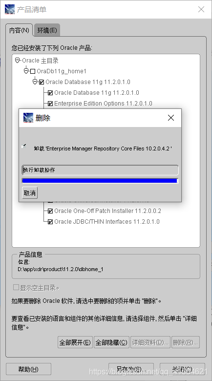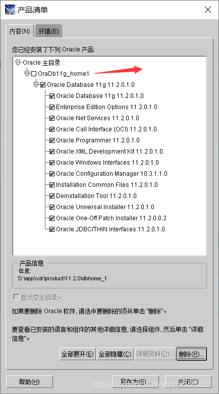 找到 oradb11g_home1 下的目录都打钩,最后点击删除