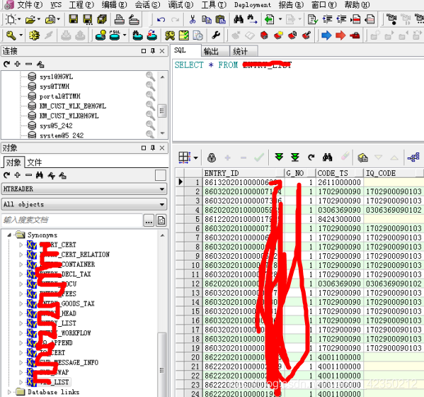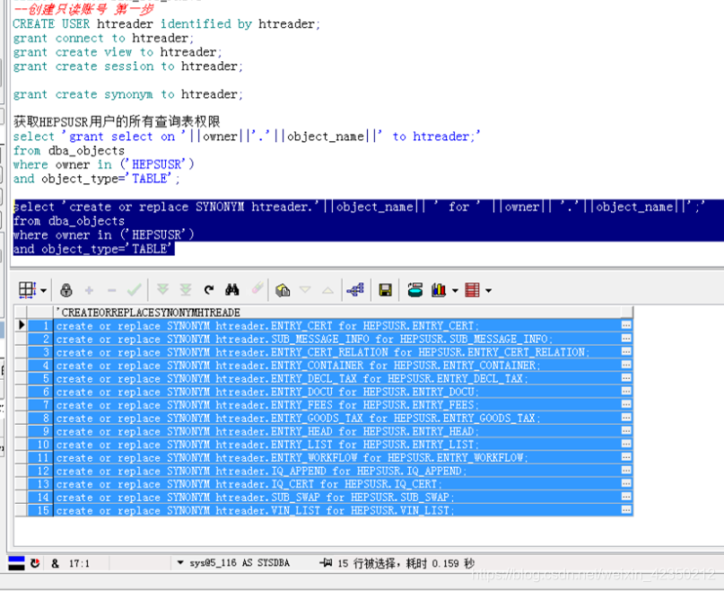 在只读账号htreader端执行:添加显示各个表信息;在sysnonym目录下,tables目录下无显示 create or replace synonym htreader.vin_list for hepsusr.vin_list; create or replace synonym htreader.sub_swap for hepsusr.sub_swap; create or replace synonym htreader.sub_message_info for hepsusr.sub_message_info; create or replace synonym htreader.iq_cert for hepsusr.iq_cert; create or replace synonym htreader.iq_append for hepsusr.iq_append; create or replace synonym htreader.entry_workflow for hepsusr.entry_workflow; create or replace synonym htreader.entry_list for hepsusr.entry_list; create or replace synonym htreader.entry_head for hepsusr.entry_head; create or replace synonym htreader.entry_goods_tax for hepsusr.entry_goods_tax; create or replace synonym htreader.entry_fees for hepsusr.entry_fees; create or replace synonym htreader.entry_docu for hepsusr.entry_docu; create or replace synonym htreader.entry_decl_tax for hepsusr.entry_decl_tax; create or replace synonym htreader.entry_container for hepsusr.entry_container; create or replace synonym htreader.entry_cert_relation for hepsusr.entry_cert_relation; create or replace synonym htreader.entry_cert for hepsusr.entry_cert;