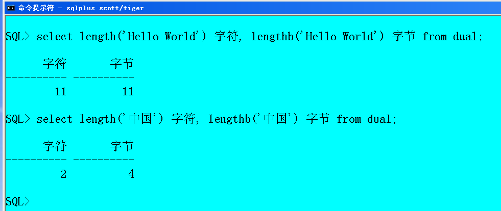 select length('中国') 字符, lengthb('中国') 字节 from dual;