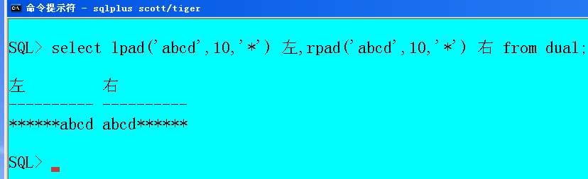 select lpad('abcd',10,'*') 左,rpad('abcd',10,'*') 右 from dual;