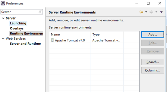 打开eclipse,选择 window – preferences – server – runtime environmen选项,