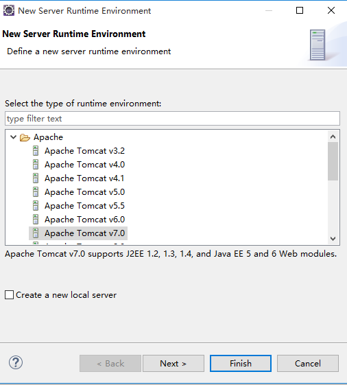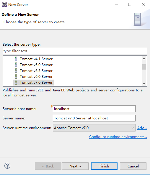 对该项目添加tomcat服务,点击链接no servers are available. click ths link to create a new server. ,在弹出的对话框中选择tomcat版本,不要点击next,直接点击finish 如图: