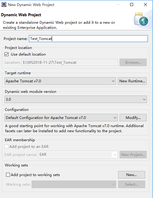 new - dynamic web project ,输入项目名”test_tomcat”,回车