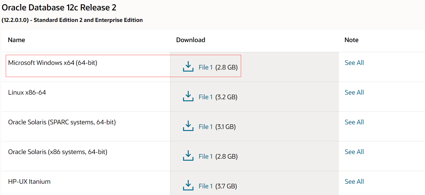 oracle database 官方下载地址:,打开后可以找个各个版本的下载文件。例如我的电脑是 win10 64位,我就要选择下图中的 file1 进行下载。