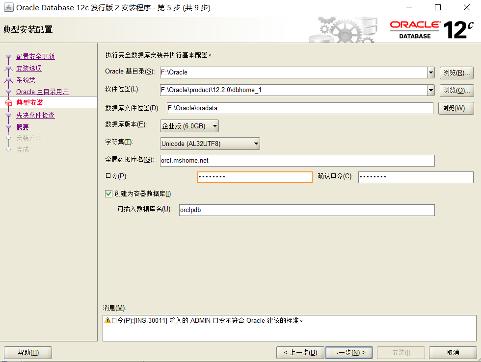 不过很奇怪的是,我用了英文和数字还是显示不符合 oracle 建议的标注,然后点击下一步,会提示口令不符合标准,不用管,继续下去就好了。