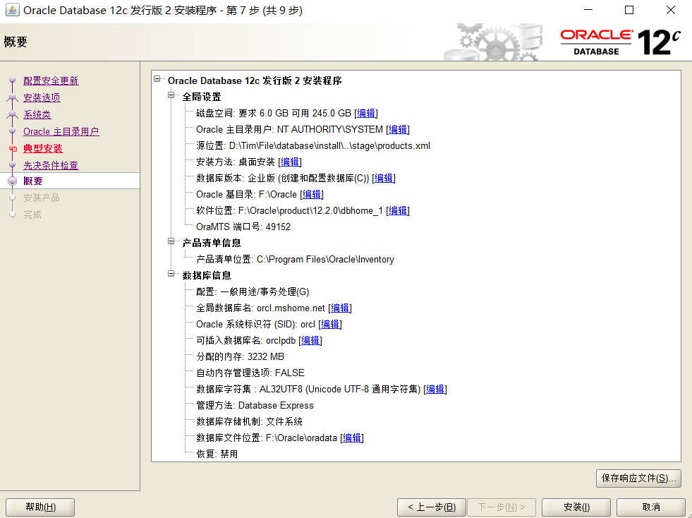 之后会花个几分钟进行安装环境的检查,然后就会显示安装概要了,如下图: