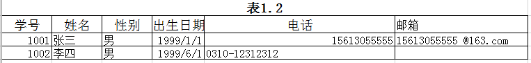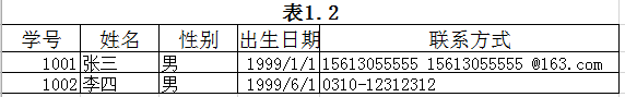 如表1.2,联系范式,对于学号‘1001’学生来说,‘联系方式’列包含电话和邮箱,可以再分,不符合第一范式要求。