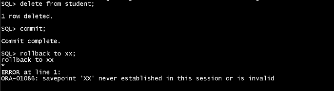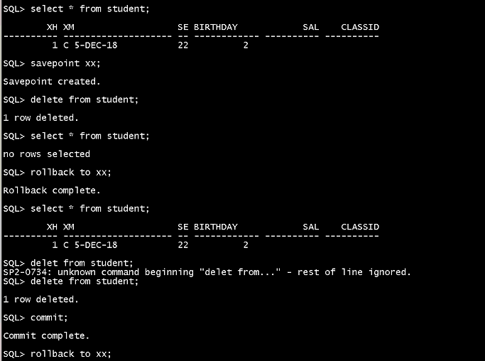 然后:rollback回滚,数据恢复完成,但是再删除后还未commit的时候起作用,一旦commit了,就无效了,如下过程