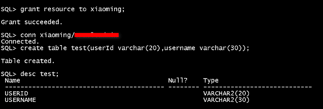 3、赋予权限:grant connect to xiaoming //赋予小明连接登录数据库的权限(此处connect其实是一种角色)