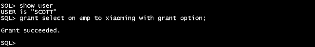 5、如果希望小明可以去查询scott.emp,也希望小明可以将该查询权限授予其他用户,那么就使用到了对象权限,即在授权的后面加上 with grant option,也就是: