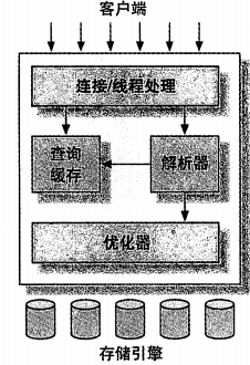 SQL层:Management Services & Utilities(系统管理和控制工具)、Connection Pool(连接池)、SQL Interface(SQL接口)、Parser(SQL解析器)、Optomizer(SQL优化器)、Caches & Buffers(SQL查询缓存)。