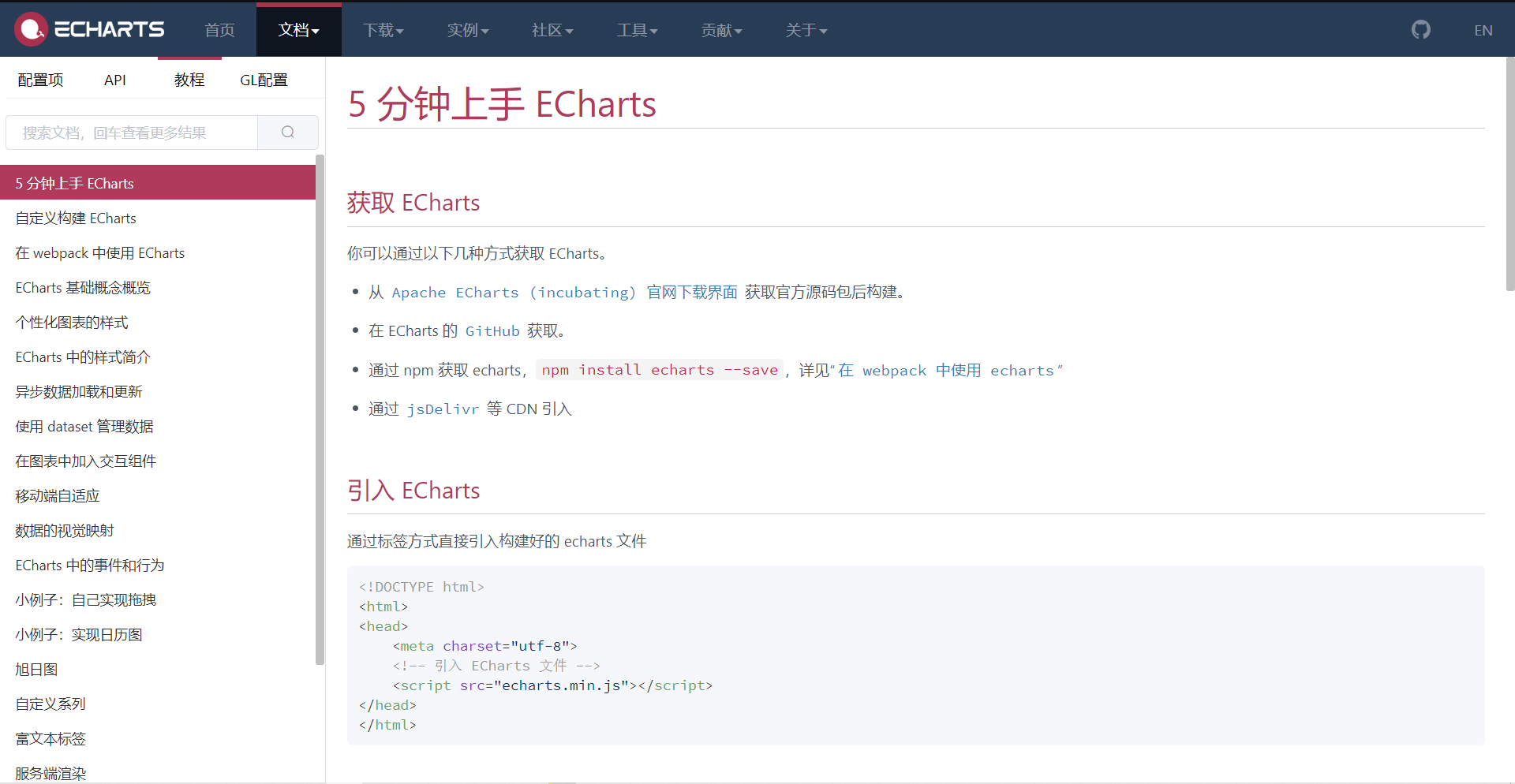 - 入门参考:官网 -> 文档 -> 教程 -> 5分钟上手 ECharts