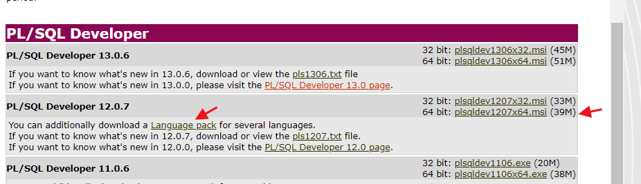 2、下载PLSQL时,版本旁边会有个“Language pack”的链接,点击后左侧选择“Chinese”即可下载汉化包。
