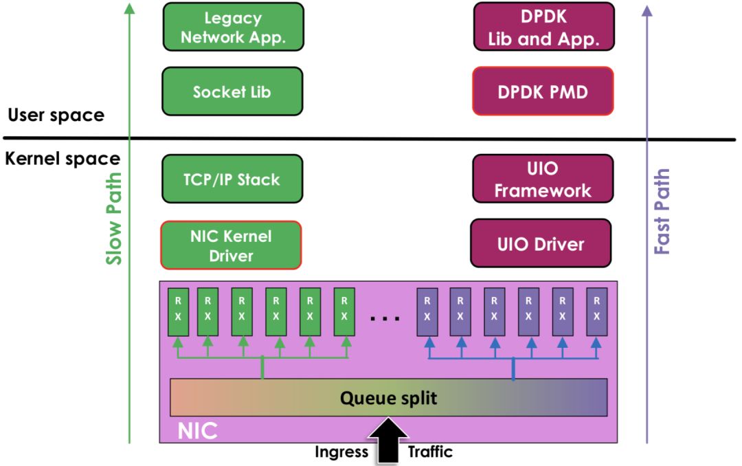 右边是DPDK的方式,基于UIO(Userspace I/O)旁路数据。数据从 网卡 -> DPDK轮询模式-> DPDK基础库 -> 业务