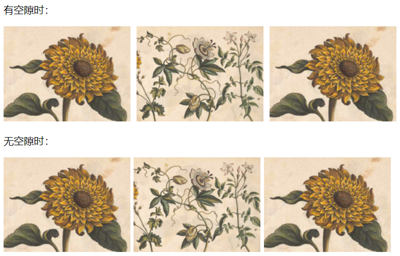 图中的三个图片之间有明显的空隙。即便是将外边距设为0,也没有效果。