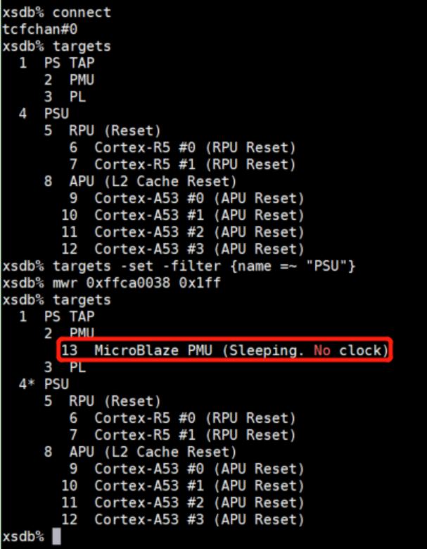 targets -set -filter {name =~ "MicroBlaze PMU"}