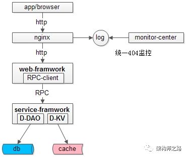 (2)反向代理层是nginx,统一http404状态码监控就实现在这一层;