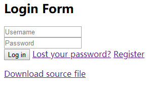 <body> <div class="container"> <section id="content"> <form action=""> <h1>login form</h1> <div> <input type="text" placeholder="username" required="" id="username" /> </div> <div> <input type="password" placeholder="password" required="" id="password" /> </div> <div> <input type="submit" value="log in" /> <a your password?</a> <a </div> </form><!-- form --> <div class="button"> <a source file</a> </div><!-- button --> </section><!-- content --> </div><!-- container --> </body>