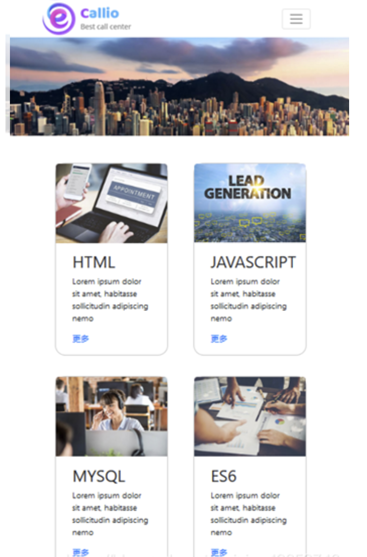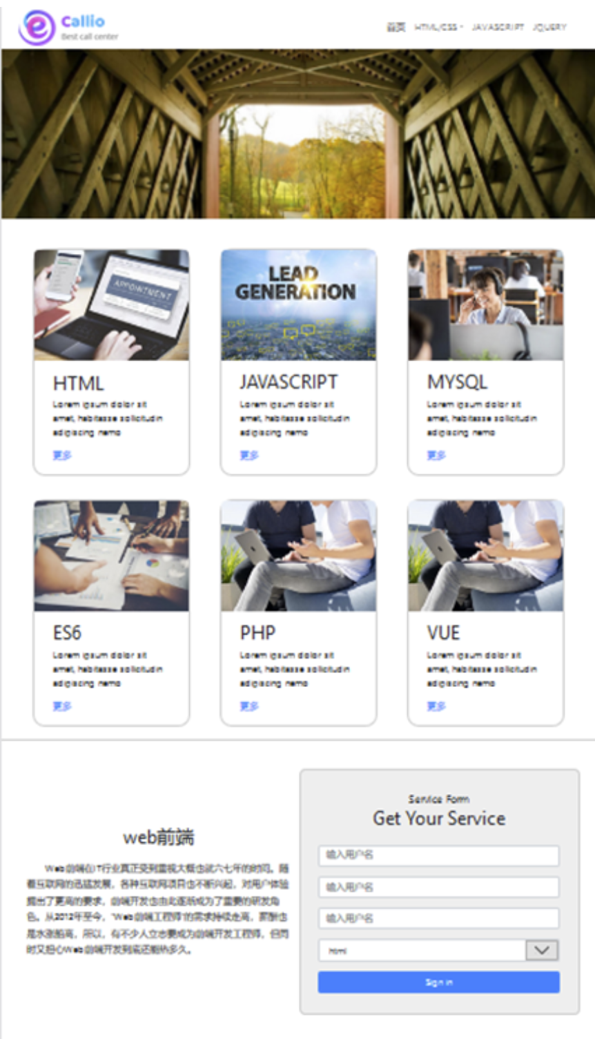 项目名称为callio,采用Bootstrap框架,包含首页index.html、css文件夹、js文件夹、img文件夹,其中,css文件夹包含style.css文件和bootstrap.min.css文件;js文件夹包含jquery.min.js文件和bootstrap.min.js文件;img文件夹包含用到的图片。