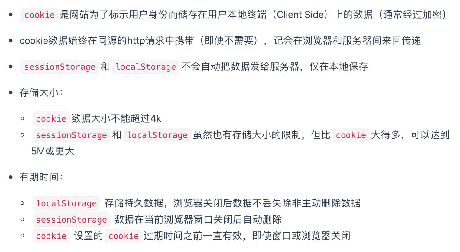 cookie数据不能超过4K,同时因为每次http请求都会携带cookie,所以cookie只适合保存很小的数据,如回话标识。