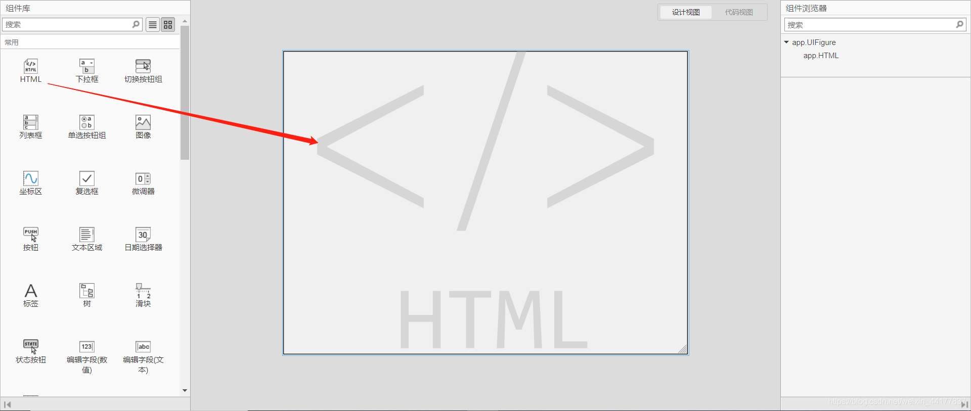 1.用的是Matlab 2020a,先在APP模块里将HTML组件拖入到界面