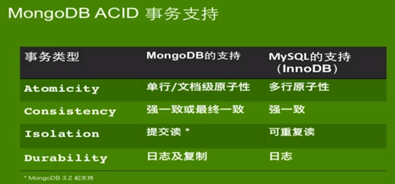 下面说一说MongoDB的事务支持,这里可能会有疑惑,前面我们在介绍MongoDB时,说MongoDB是一个NoSQL数据库,不支持事务。这里又介绍MongoDB的事务。这里要说明一下MongoDB的事务支持跟关系型数据库的事务支持是两码事,如果你已经非常了解关系型数据库的事务,通过下面一副图对比MongoDB事务跟MySQL事务的不同之处。