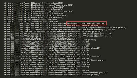 我们可以看到所有的堆栈都指向了一个名为 validateUrl 的方法,这样的报错信息在堆栈中一共超过 100 处。通过排查代码,我们知道这个方法的主要功能是校验 URL 是否合法。