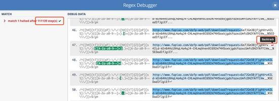 当你点击左下角的「regex debugger」时,它会告诉你一共经过多少步检查完毕,并且会将所有步骤都列出来,并标明发生回溯的位置。