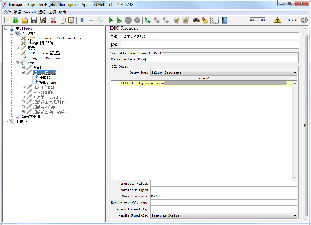 2、添加jdbc request,query type=select statement,varibale name=mysql。建议在数据库工具执行一次后,在后面察看结果树时做对比,检查是否提取正确。